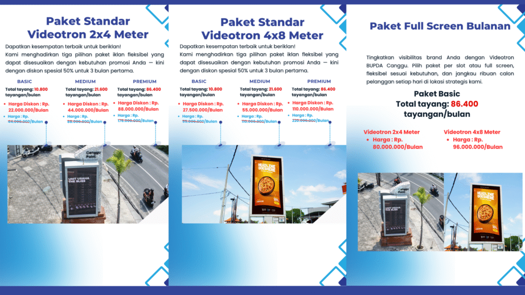 Videotron BUPDA Canggu menghadirkan berbagai pilihan paket promosi yang fleksibel dan dapat disesuaikan dengan kebutuhan brand, baik untuk kampanye jangka panjang maupun promosi berdurasi singkat. Seluruh paket dirancang untuk memberikan exposure maksimal di lokasi strategis kawasan Canggu dengan frekuensi tayang tinggi setiap harinya.