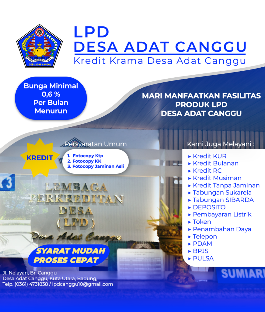 - LPD Adat Canggu: Proses pengajuan kredit melibatkan persetujuan dari Kelian Adat dan Kelian Banjar.